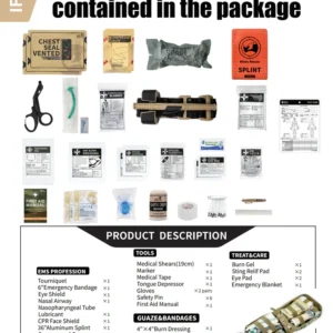 This kit is well-equipped with user-friendly, compact, and popular survival and first aid supplies for massive bleeding control. It includes a military combat tourniquet, tactical Israeli pressure dressing, and compressed gauze – everything you need to manage serious hemorrhage effectively.